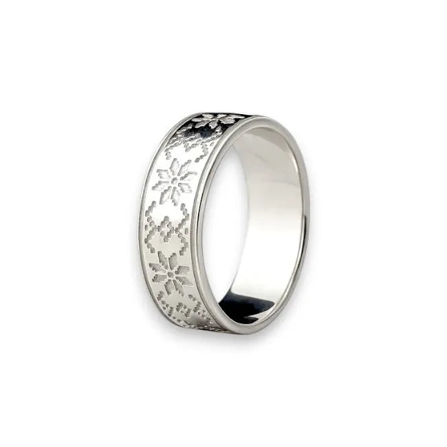 The intricate pattern is inspired by classic folk embroidery and decorative elements, symbolizing protection, harmony, continuity, and strength. Its clean, wide-band silhouette makes it a versatile piece, suitable for both men and women who appreciate meaningful jewelry with character.